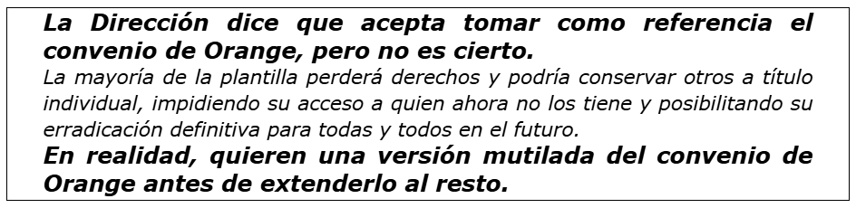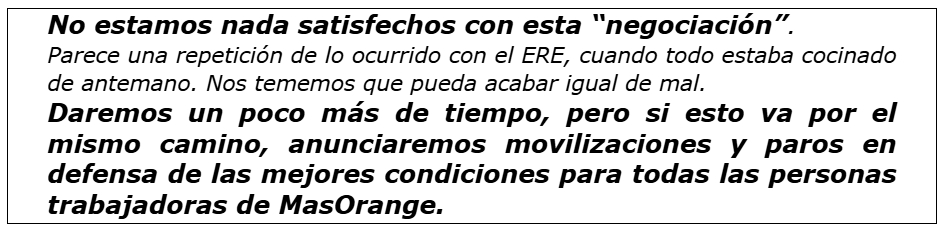Consideramos que el peor resultado no sería la ausencia de acuerdo, sino un retroceso en las condiciones laborales para la mayoría de la plantilla, o bien que la Dirección siga negando las ventajas de los convenios de MasOrange a las personas trabajadoras que carecen de convenio propio.